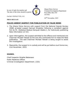 According to a police statement dated 20th November 2025, Amadotor was picked up with support from the National Signals Bureau (NSB) following a formal complaint lodged by the former board chair.