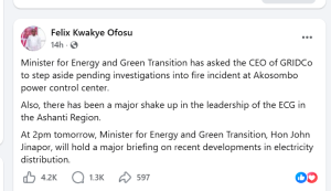 In response, the minister directed the Chief Executive Officer of Ghana Grid Company (GRIDCo) to step aside pending investigations into the incident.