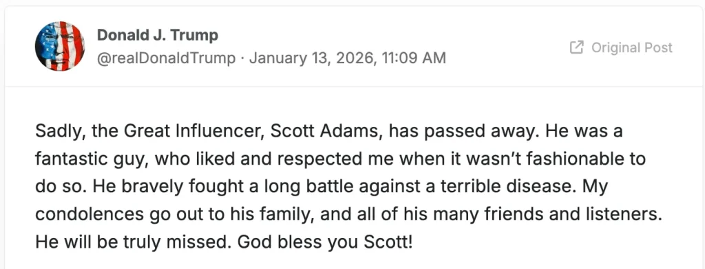 Less than a month after using Truth Social to taunt slain Hollywood director Rob Reiner immediately after his murder, Trump penned a message of “condolences” for the MAGA illustrator, who succumbed to cancer on Tuesday. Adams’ ex-wife, Shelly Miles, announced his death during a Real Coffee with Scott Adams livestream, saying the 68-year-old had passed away in hospice care seven months after he announced he was battling metastatic prostate cancer.