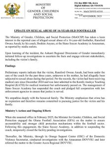 The Ministry further noted that when the Minister assumed office in February 2025, she engaged the Ghana Football Association (GFA) to strengthen child protection mechanisms within football. Following this, the Siano Soccer Academy temporarily closed its facility pending investigations.