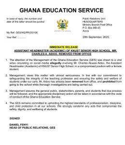 In a statement dated 29th September 2025 and signed by Daniel Fenyi, Head of Public Relations at GES, the removal is as a result of a viral video circulating online, where the Assistant Headmaster in question was allegedly seen in a compromising situation with a female student. The incident has sparked widespread public outrage and calls for swift action.