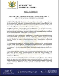 In a statement issued on Tuesday, April 14, the Ministry addressed growing public concern and misinformation surrounding the Security and Defence Partnership between Ghana and the EU.