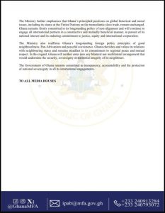 Reaffirming its foreign policy stance, the Ministry stressed that Ghana remains committed to principles such as non-alignment, good neighbourliness, Pan-Africanism, and peaceful coexistence, and will not engage in any agreement that compromises its sovereignty or the security of its neighbours.