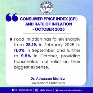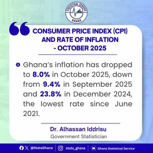 On Wednesday, November 5, GSS announced that Ghana’s inflation rate had fallen to 8% in October 2025, the lowest level since June 2021. This marks a tenth consecutive month of decline, down from 9.4% in September and significantly lower than the 23.8% peak recorded in December 2024.