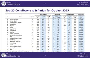 The Ghana Statistical Service (GSS) has released the top 20 contributors to inflation for October 2025, with food items like fufu and soup, kenkey with fried fish, herrings (smoked), plantain, and beef among the major drivers. Other contributors include cooked rice, tomato paste, vegetable oil, electricity, charcoal, accommodation, and school fees.