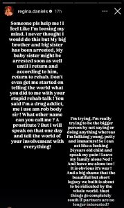 “Someone please help me! I feel like I’m losing my mind. My big brother and big sister have been arrested, and my baby sister might be arrested soon as well — all because I refused to return and, according to him, refused to go back to rehab,” she wrote.