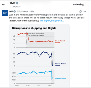 In its April 2026 World Economic Outlook, the Fund explained that disruptions to shipping and aviation increase trade costs, strain supply chains, and hit tourism-dependent and import-reliant economies the hardest.