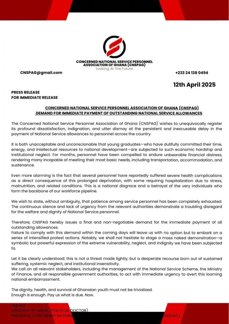 The Concerned National Service Personnel Association of Ghana (CNSPAG) has issued a strong statement condemning the situation, describing the delays as “unacceptable, unconscionable, and a national disgrace.”