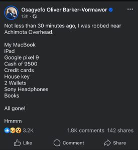 In a Facebook post made about 30 minutes after the alleged attack, he listed a MacBook, iPad, Google Pixel 9, GH₵9,500 cash, credit cards, house keys, two wallets, Sony headphones, and books as items taken during the incident.