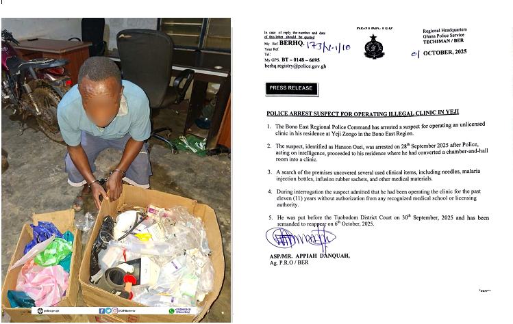 The suspect, identified as Hanson Osei, was arrested on September 28, 2025, after police acting on intelligence proceeded to his home, where he had converted a chamber and hall room into a clinic.