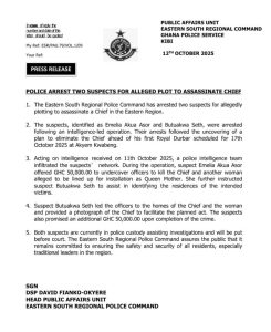 The suspects, identified as Emelia Akua Asor and Butuakwa Seth, were picked up during an intelligence-led operation that uncovered their plan to eliminate the chief ahead of his first Royal Durbar, scheduled for October 17, 2025, at Akyem Kwabeng.
