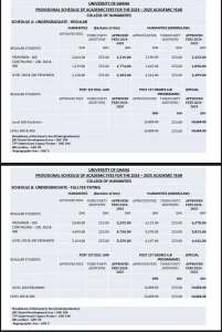 Accra, Ghana — Students and parents are expressing concern and frustration following the release of a provisional academic fee schedule showing that the University of Ghana (UG) has increased fees for the 2025/2026 academic year by more than 25 percent across its colleges.